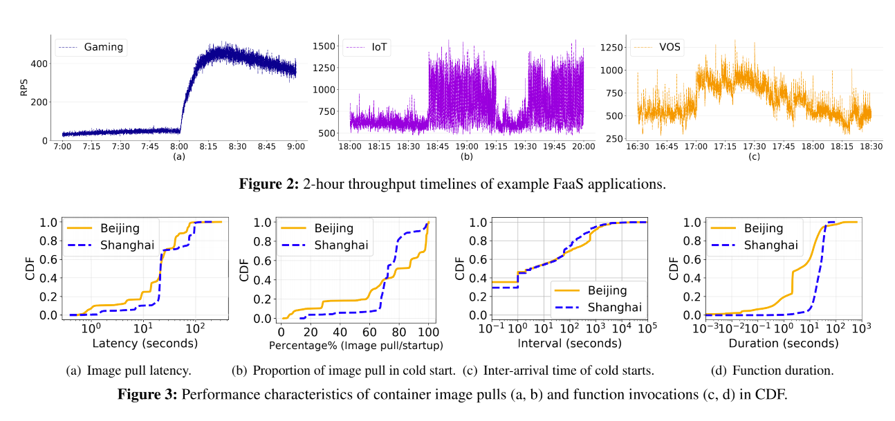- 显示超过50%和60%的函数调用请求花费至少80%和72%的整体函数启动时间来拉取容器镜像,这表明镜像拉取时间成为了大多数功能的冷启动成本。