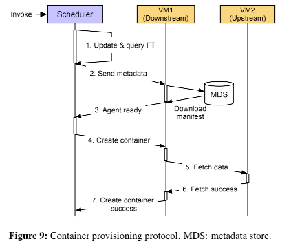 当调度器将函数元数据发送给VM,VM一旦收到信息会执行两个任务。从元数据存储库加载并检查清单,获取镜像层的URL,并把URL信息持久化到VM的本地存储中。VM回复调度器表明自己已经准备好开始为请求的函数创建容器运行时,调度器收到回复后向VM发送一个创建容器的RPC请求,VM处理清单配置,并向调度器发送一个RPC表明容器已经成功创建。