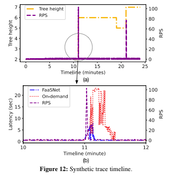 FAASNET将元数据繁重的管理任务卸载到现有的FAAS调度器上,因此每个单独节点都扮演着从其父级对等获取数据的相同角色。FT的根节点没有父级对等物,而是从注册表中获取数据。FAASNET的FT设计可以完全消除到注册中心的I/O流量,只要一个FT至少有一个活跃的虚拟机存储所请求的容器。早些时候,我们的工作负载分析显示,一个典型的FAAS应用的吞吐量将始终高于0RPS,在实践中请求突发更有可能讲一个FT规模从1到N,而不是从0到N。