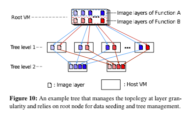图10中显示了一个例子,在这个例子中,一个虚拟机中存储着不同函数容器镜像的层文件,因此当许多下游的虚拟机同事从这个虚拟机获取层时,可能会出现网络瓶颈。这是因为许多重叠的层树形成了一个完全连接的、端对端的网络拓扑结构。如果虚拟机用高带宽的网络连接,全对全的拓扑结构可能会有很好的规模。然而如果每个虚拟机都收到了资源限制,全对全的拓扑结构很容易造成网络瓶颈,阿里云内部使用的是2核CPU、4G内存、1Gbps网络的小型VM。