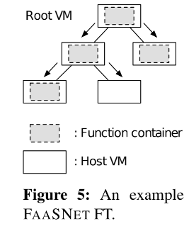 图8显示了一个可能的FT布局的例子,为了避免网络瓶颈,FAASNET限制了一台虚拟机可以放置的函数数量,目前设置是20个。