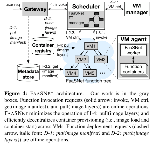 - 在函数调用的路径上,如果没有足够的虚拟机、或者所有的虚拟机都很忙的情况下,调度器首先与虚拟机管理器进行通信,从空闲的虚拟机池中扩展出活动的虚拟机池。然后调度器查询其本地的FT元数据,并向FT的FAASNET工作者发起RPC请求,从而启动容器供应流程。容器运行时供应过程实际上是分散的, 并在FT尚未有容器运行的本地供应的虚拟机进行准备工作。调度器在关键路径之外,而FAASNET工作层根据需求获取函数容器层,并从分配的对等虚拟机中并行地创建容器运行时。