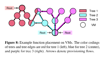 函数在虚拟机上的放置,为了提高效率,FAASNET允许一个虚拟机容纳属于同一个用户的多个函数。只要虚拟机有足够的内存来承载函数,一个虚拟机可能参与到多个重叠的FT的拓扑结构中。
